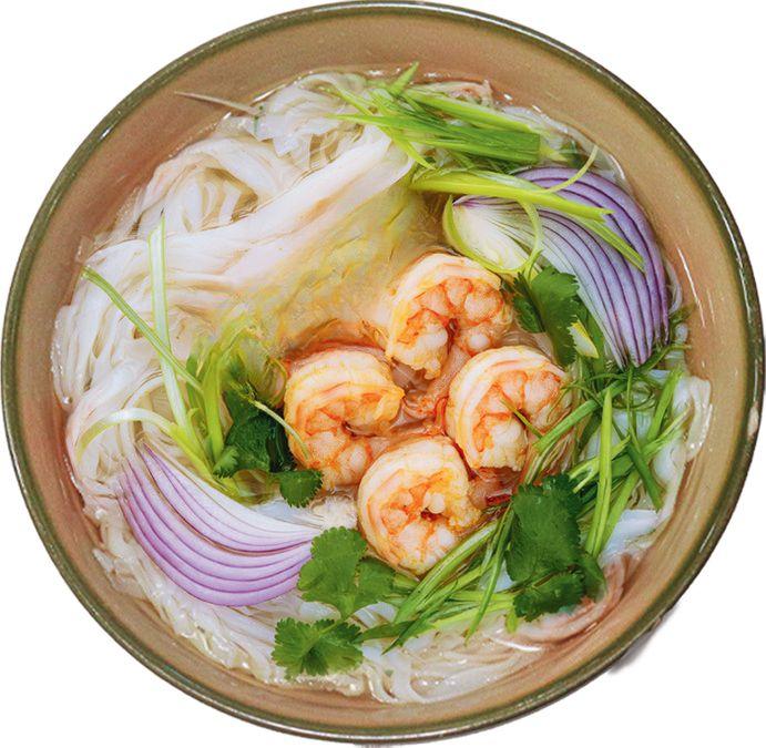 Классический мясной бульон, яичная лапша, куриное филе, тигровые креветки.