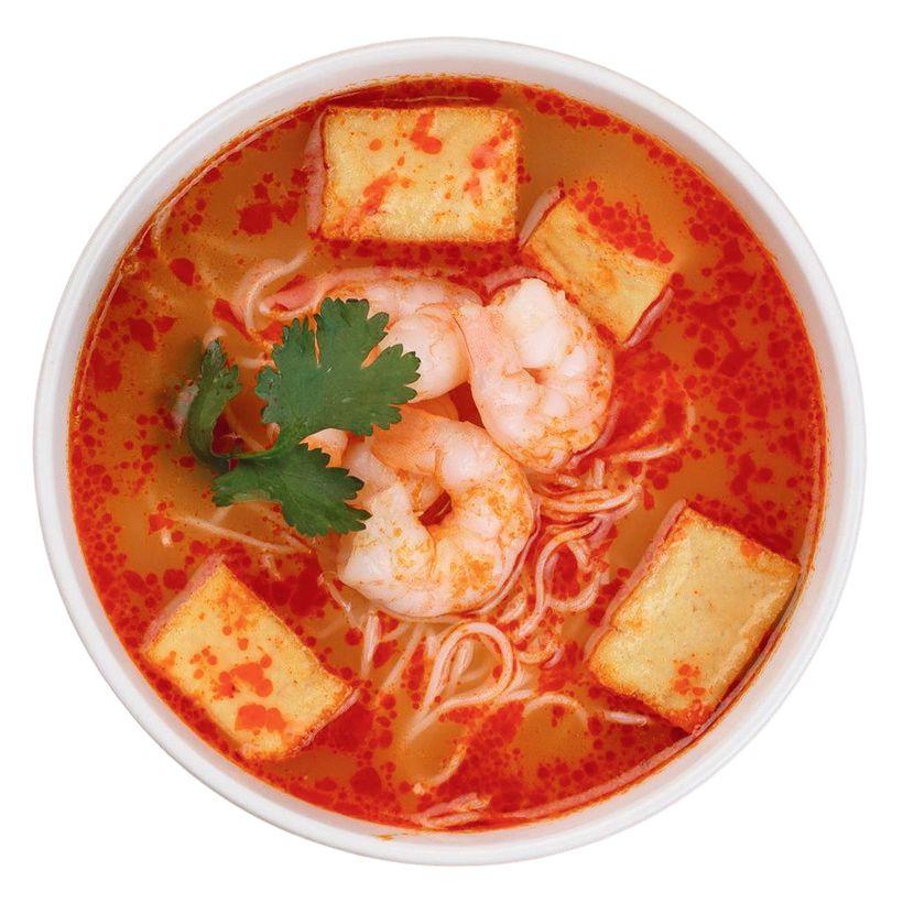 Популярный азиатский мясной бульон с кокосовым молоком, рисовой лапшой, креветками, кальмарами и шампиньонами.