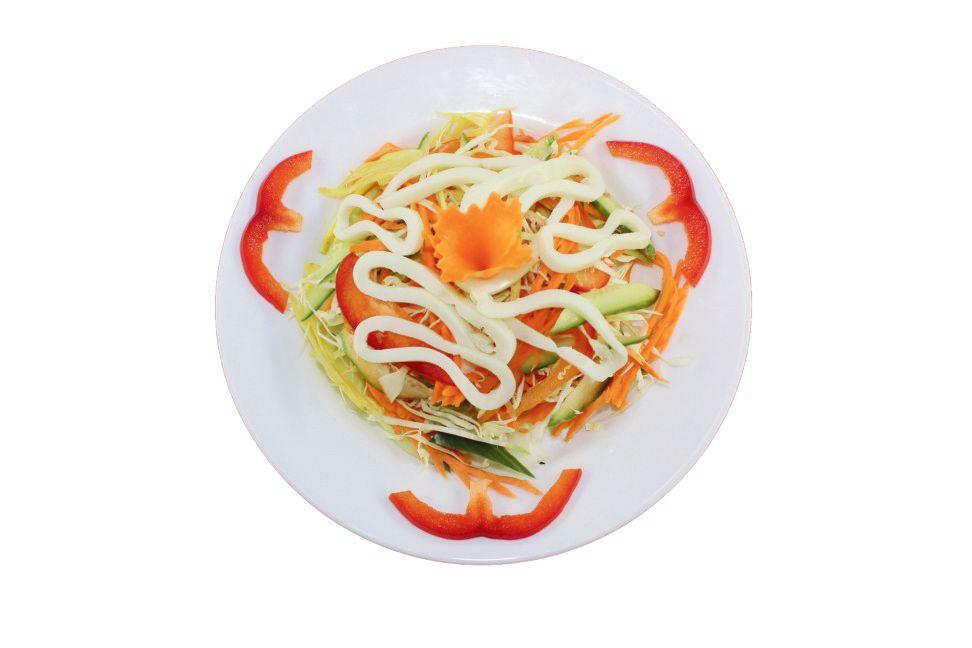 Великолепное сочетание кальмаров, капусты, моркови и зелени под фирменным соусом.