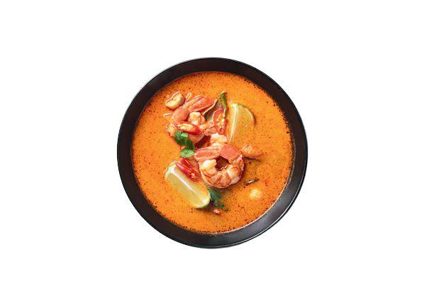 Популярный азиатский мясной бульон с кокосовым молоком, креветками, кальмарами и шампиньонами.